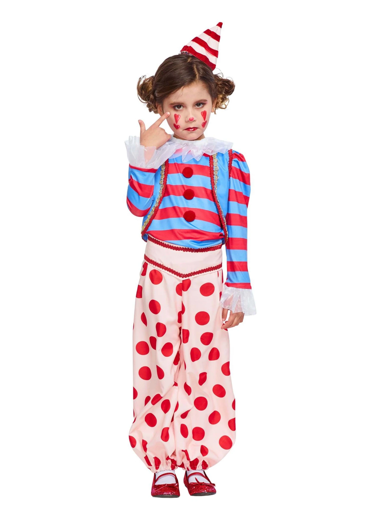 Get ready to hear wild applause when you wear your Vintage Clown Costume for Girls! The polyester pullover shirt is printed with blue and red stripes and sewn with pleated white organdy at the neckline and sleeves. The blue vest is trimmed with gold and red braid. The polka-dotted pants have gently puffed lower legs and are also decorated with red braid. Once you slip on the cone-shaped, striped hat, you’re ready to start your act!