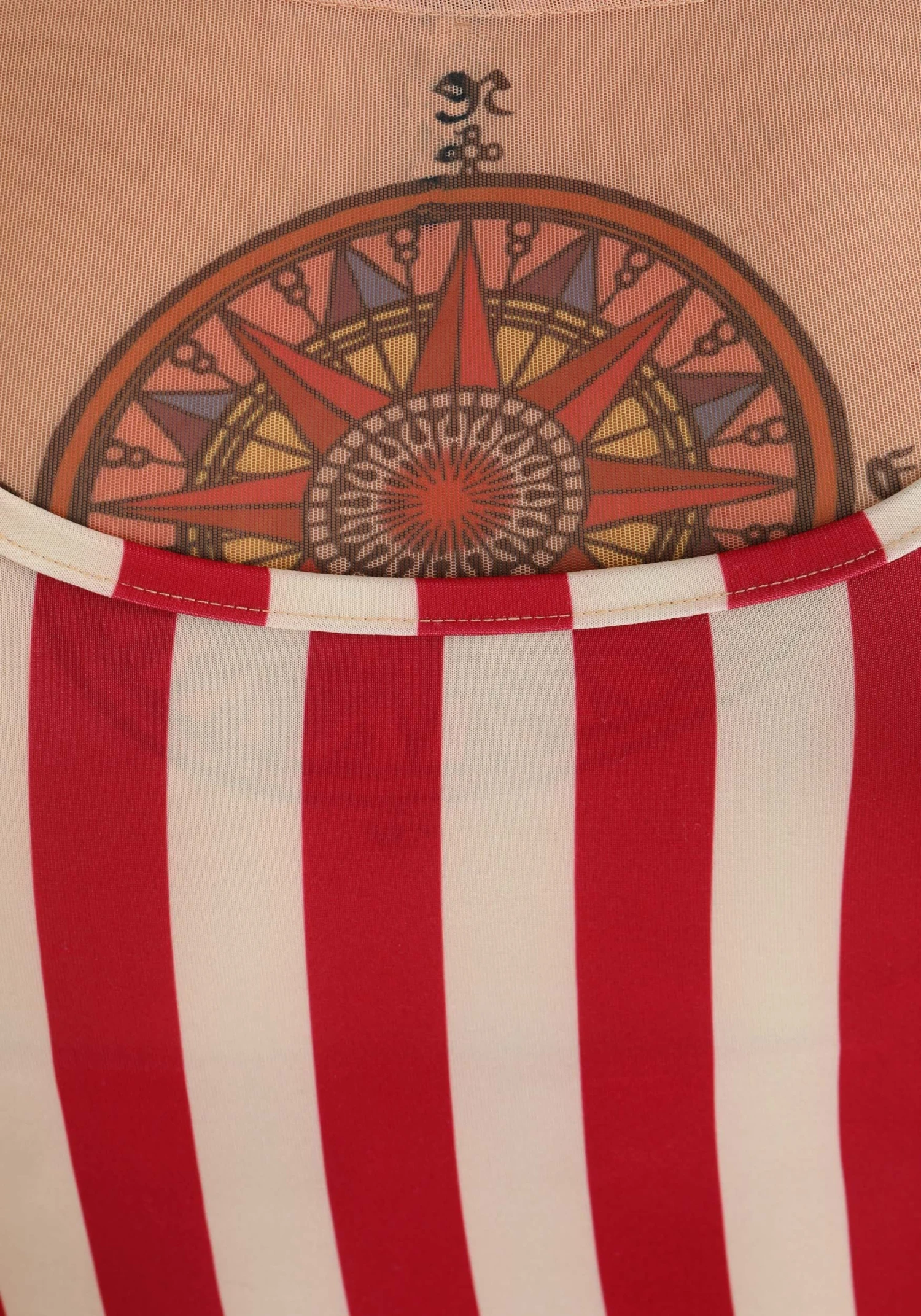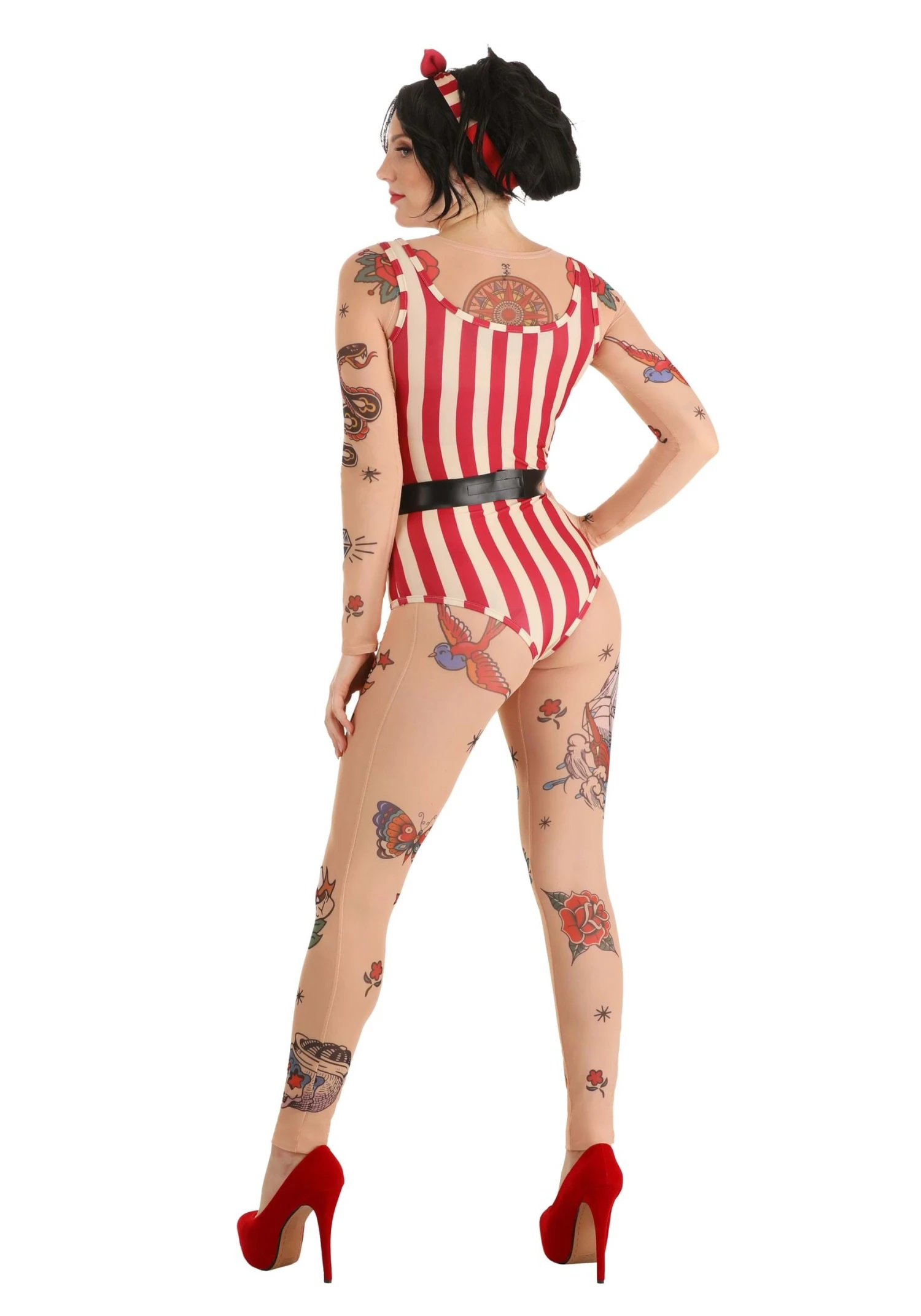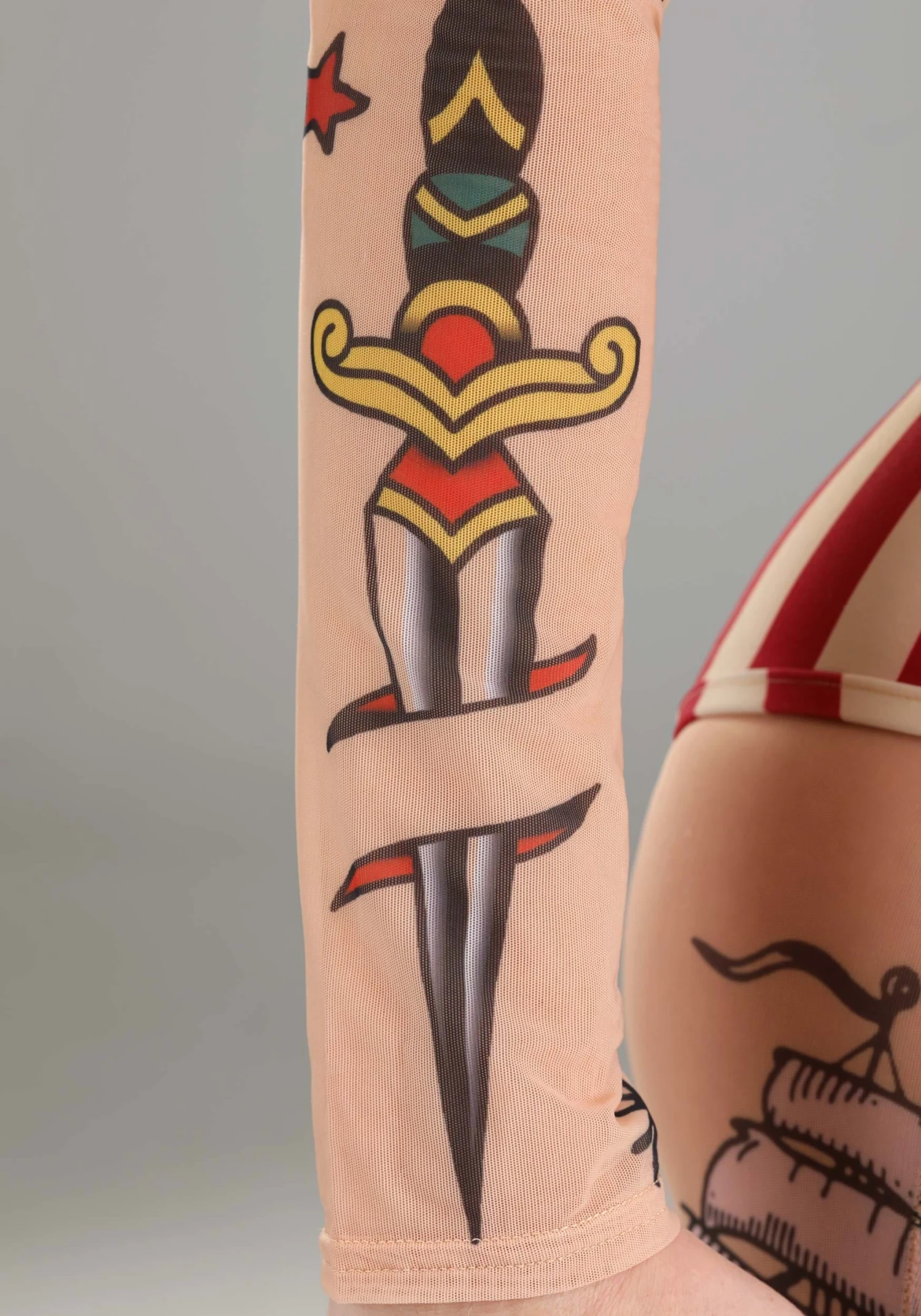 You’ll look so great in this exclusive Vintage Strong Woman Costume for Women that you might be tempted to sell tickets! The outfit includes a sheer shirt and leggings, both printed with classic tattoo graphics such as skulls, roses, stars, ships and more. The bodysuit is printed with red and white stripes and has a drapey red bandeau across the bust. A headband of the same fabric holds your hair back and a black belt cinches at the middle.Â