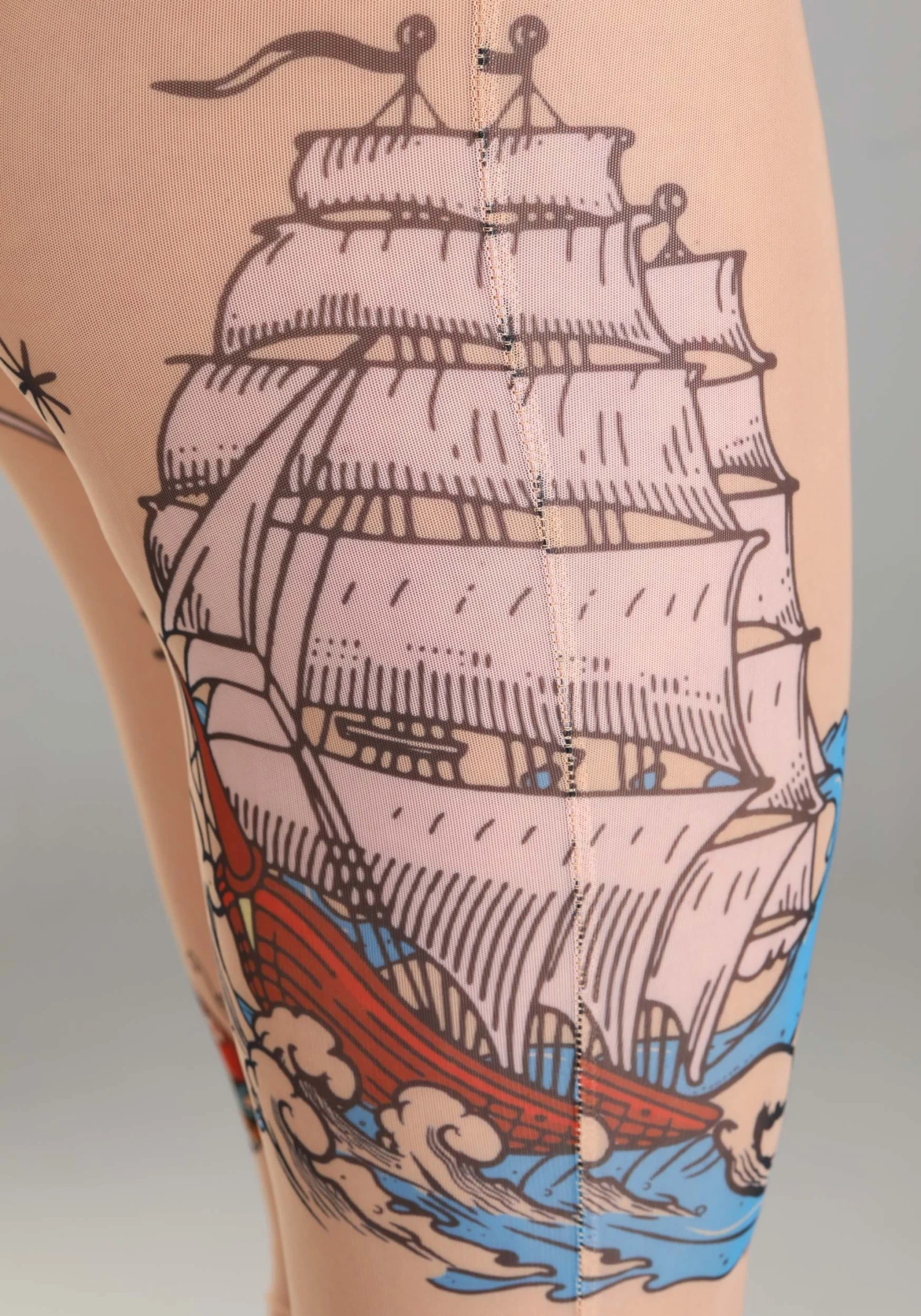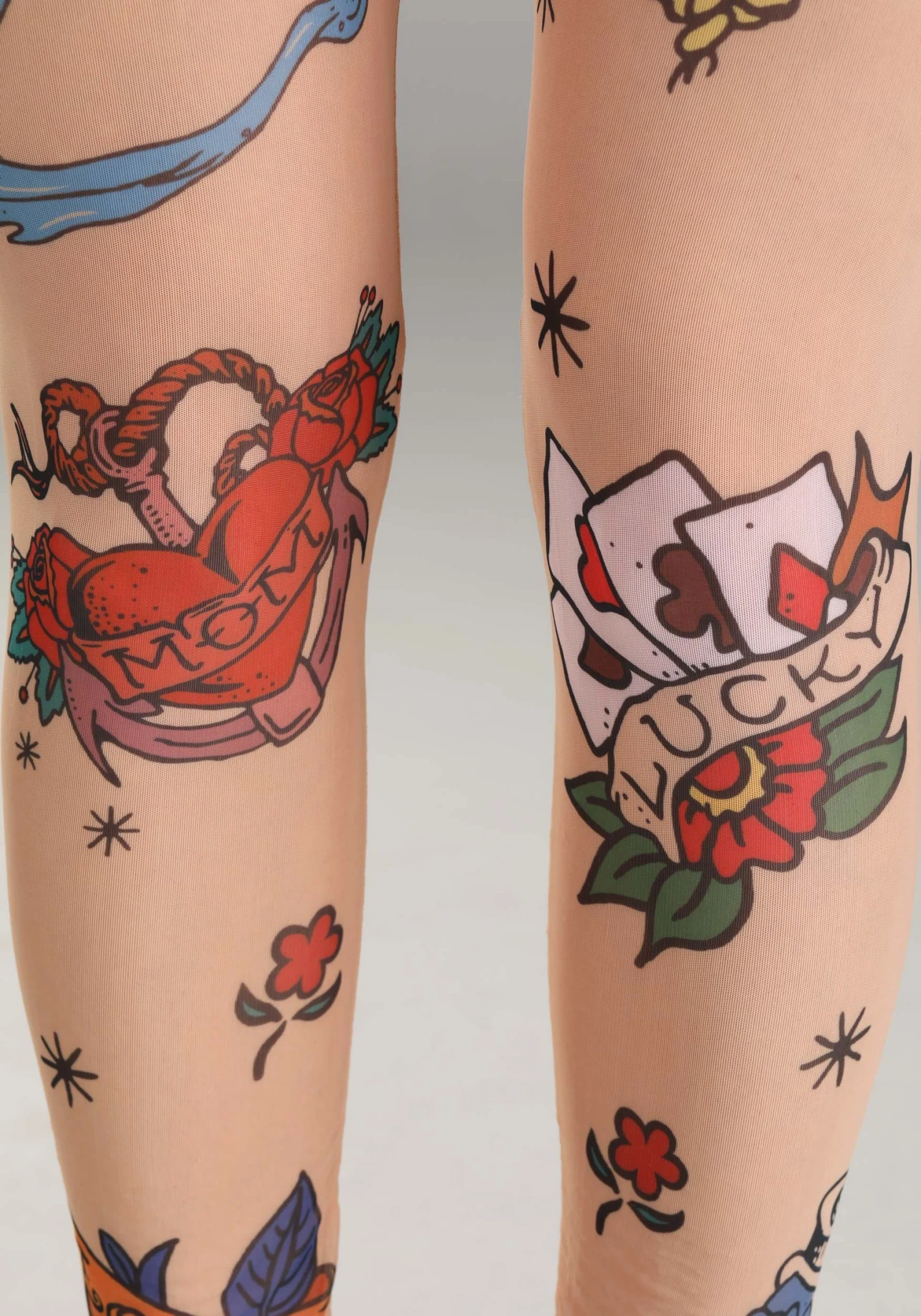 - Mesh leggings have elastic waistband, printed tattoo graphics on both legs