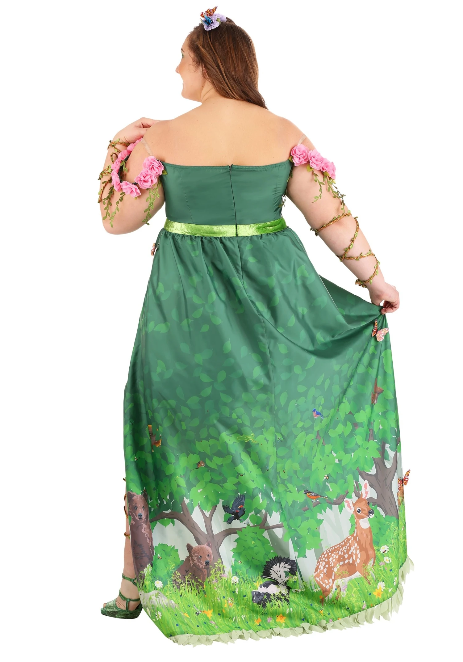 Let your nature goddess colors shine through with this Mother Nature costume. This Made by Us exclusive blossomed in the minds of our in-house design team and we’re happy to help you become the Gaia that we all need! Start with a full-length green gown that is printed to show tall trees, bright flowers, cuddly critters, and even 3D butterflies. One twirl in this dress will make nature feel alive at your feet! Rose-colored flowers highlight your neckline and our vine-like arm and leg bands bring your goddess might to bear. Crown your look with a headpiece that features nesting birds and butterflies and all that’s left is greeting your worshipers! Â