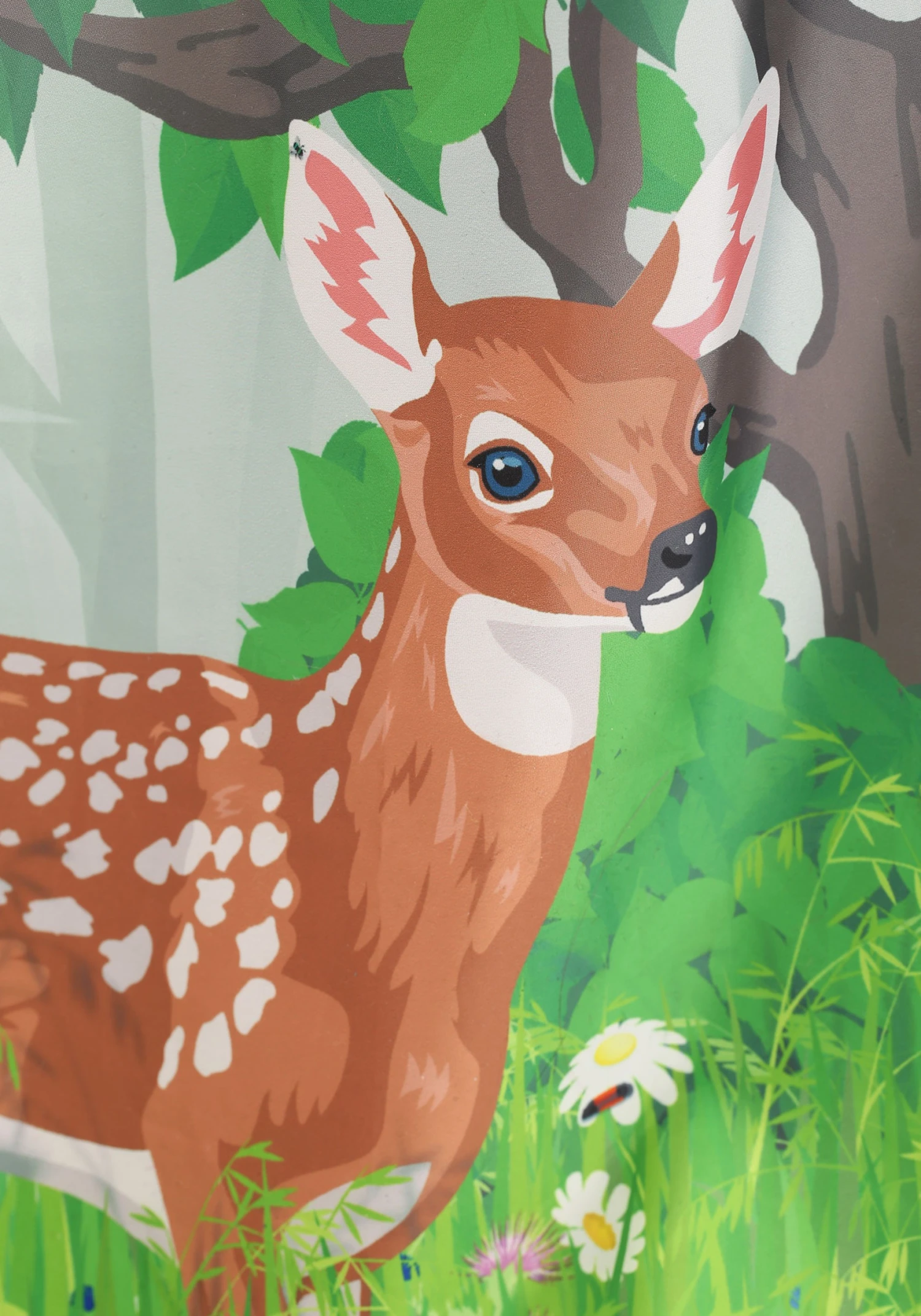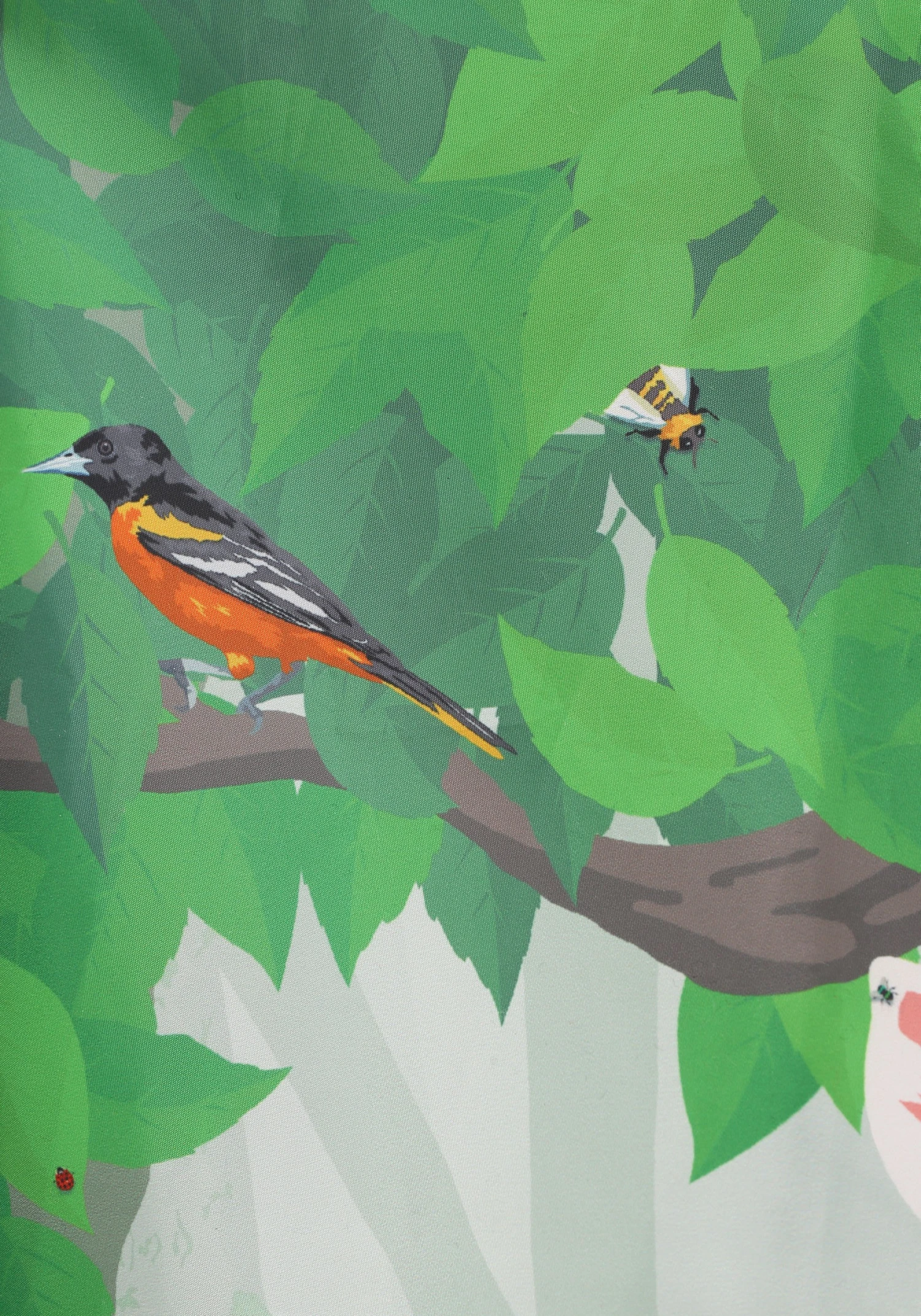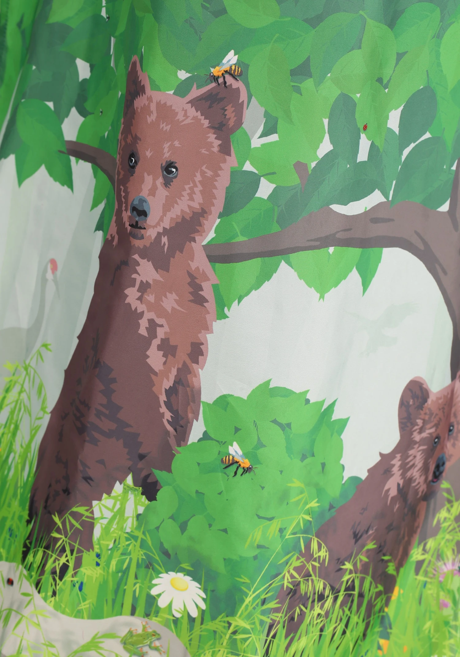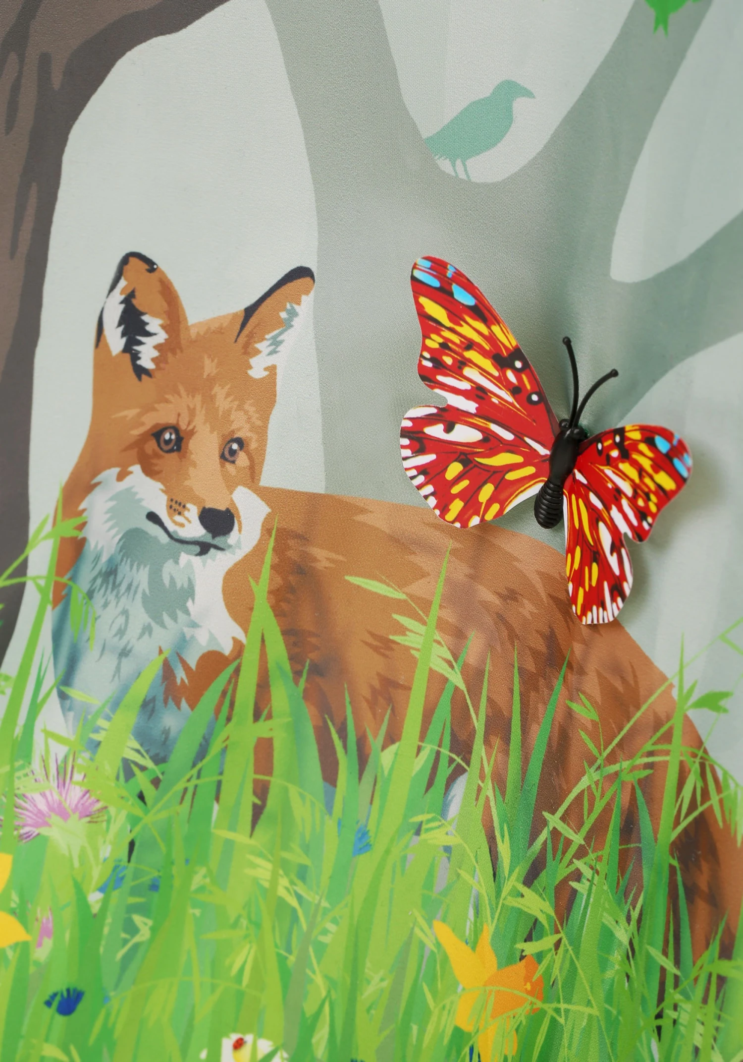 - Appliqued plastic butterflies on dress front over printed graphics