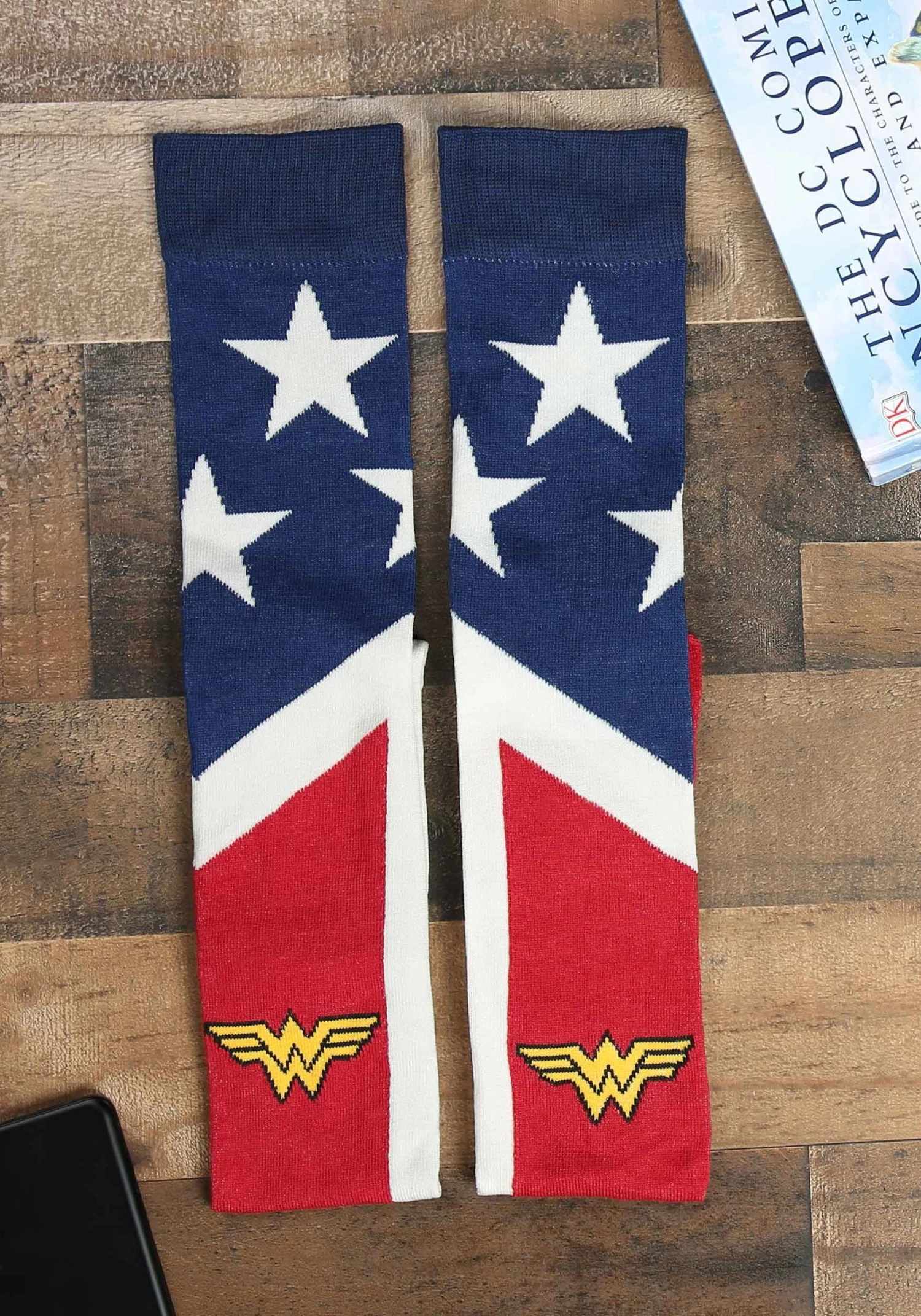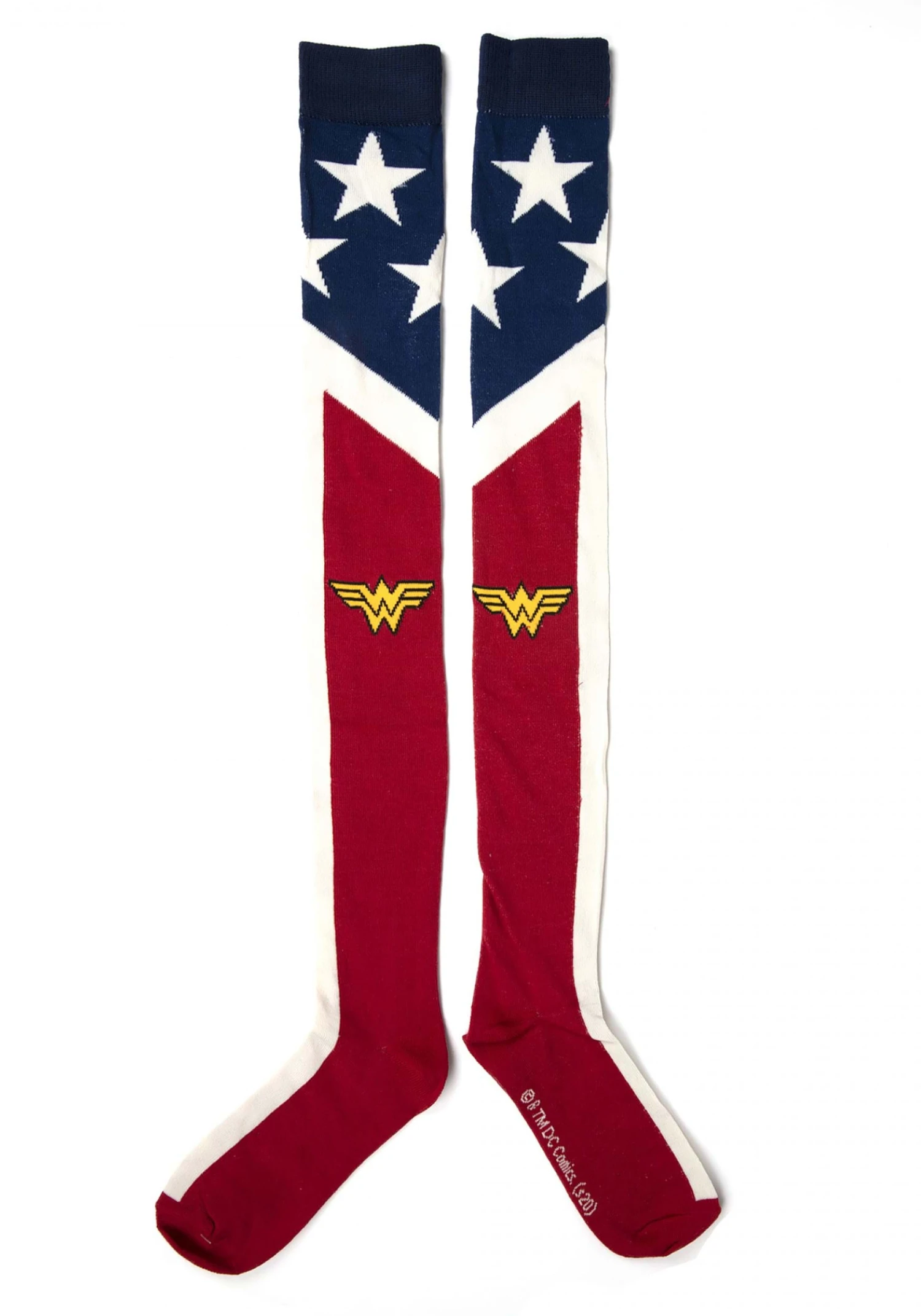 Behold the answer to your superhero comfort needs! These officially licensed Suit up over the Knee Wonder Woman Socks made of soft polyester and spandex. They are printed with American flag graphics and the Wonder Woman logo. Wear them under pants or skirts, with loungewear or super-suit – whatever you choose, you’ll save the world and look crazy good doing it!