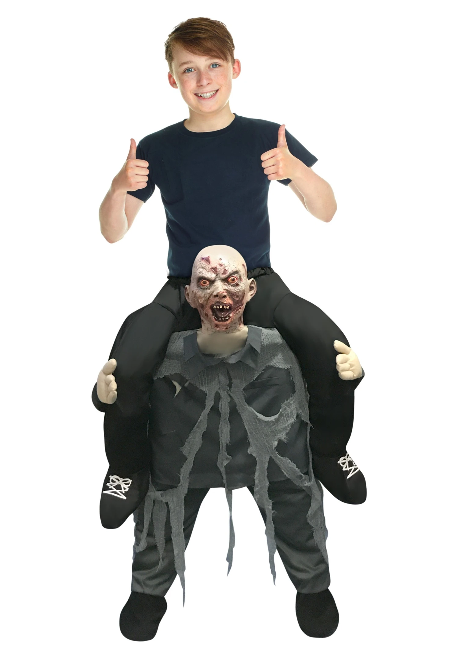 This funny and slightly scary costume creates an optical illusion that may shock some and make others smile. The costume is a pair of stretchy black pants featuring tattered gray fabric to make your legs become the zombie’s leg (or appear that way at least.) Plush legs and a zombie’s head is attached to the waistband making it look like the zombie is holding you up. Classic prank!Â